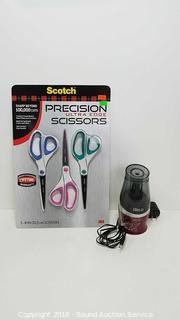 Mood Light LED Alarm Clock (refer to photos for a list of functions), 3-Pack Scotch Scissors, Pencil sharpener is tested, works.