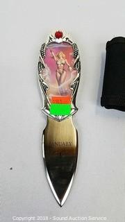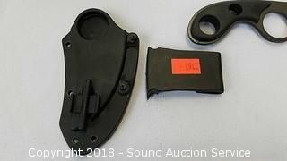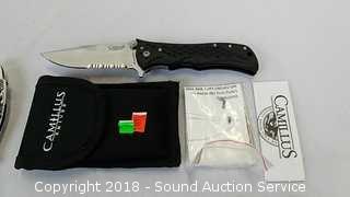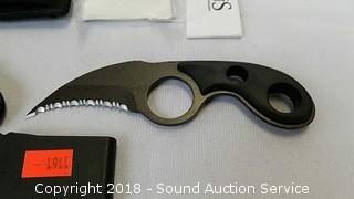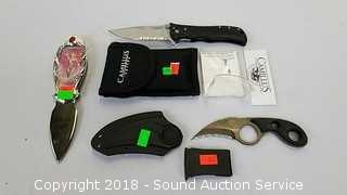 Includes: Camillus Robo Power AUS 8 Folding Knife w/Sheath (Like New, Very Sharp), Serrated Eagle Claw Knife w/Sheath (belt clip on sheath is broken), and Knightstone Zodiac Decorative Folding Pocket Knife (January).
