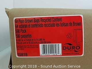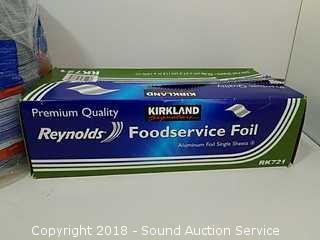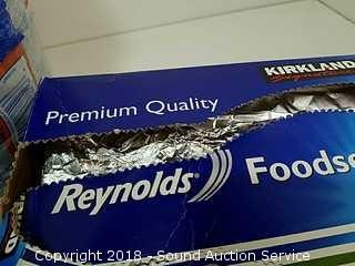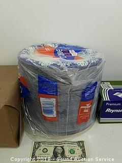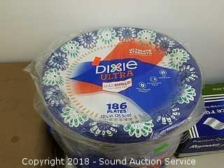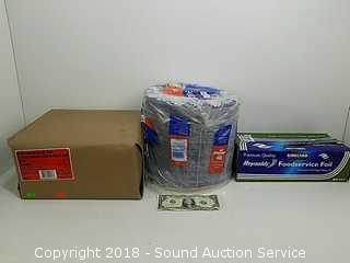 Includes: (186) Dixie Ultra Paper Plates, Reynolds Food Service Aluminum Foil Sheets (has been opened, mostly full), and 500-Pack of 6" x 3.6" x 11" brown paper bags.