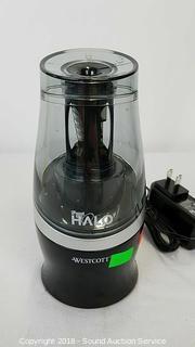 Pencil sharpener is electric, tested, works. Includes: (23) packs of 3" x 3" post-its, and approx. 250 premium heavyweight sheet protectors.