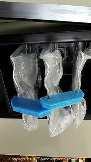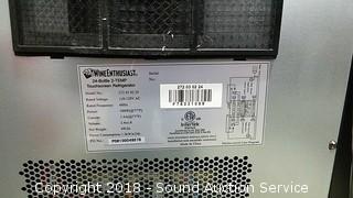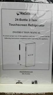 Slimline edition. Dual zone. Came in original box, had to pull it out for pictures. By Wine Enthusiast. Has a large dent in the top, door is unattached, wire running from door to unit is cut, needs to be reconnected, cooling component still works.