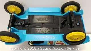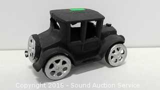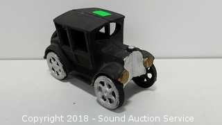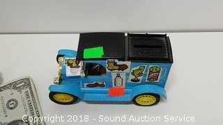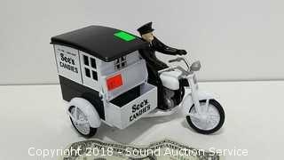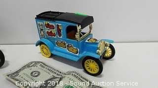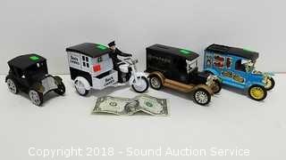 Includes: Cast Iron Model A, Ertl Replica Chevrolet 1923 Delivery Van Coin Bank, Ertl Replica Ford 1915 Model T Van, and See's Candy Diecast Sidecar Delivery Bike.
