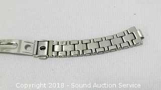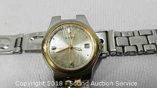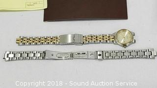Comes with original purchase receipt and paperwork, extra band. Needs a new battery. Some scratching on the glass. Also missing the band pin. It is Eco-drive, water resistant. Purchased from Panowicz Jewelers for $208.