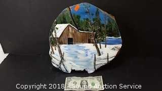Signed "Duttan? '96". Farmhouse scene. Approx. 2-1/2" thick, 12" diameter.