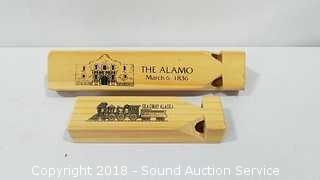 Comes with wicker basket. Includes: train whistle, bamboo and wooden flutes, and pan flute.