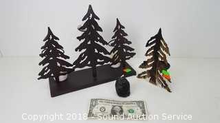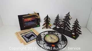 Also includes (4) canvas coasters, metal picture frame, metal tree votives, and metal wall clock.