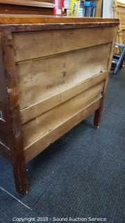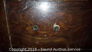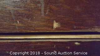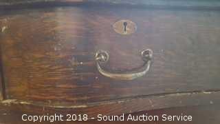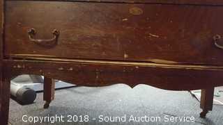 Dovetail construction. Wooden castors. The bottom is split on the top left drawer and has no drawer pull. Middle drawer is missing the left drawer pull. Some scratches in the finish. Skeleton key locks, no key. Approx. 34" H, 38" W, 19" D.