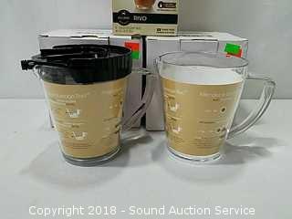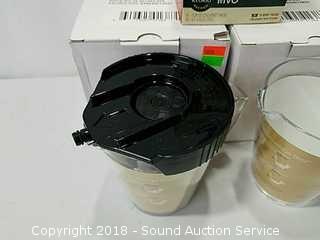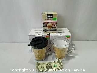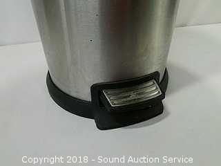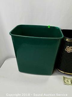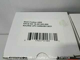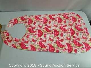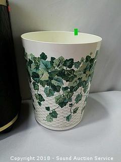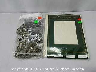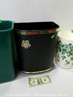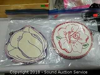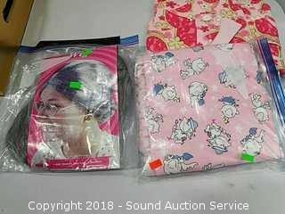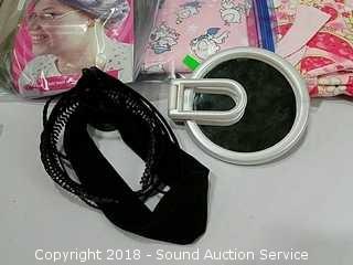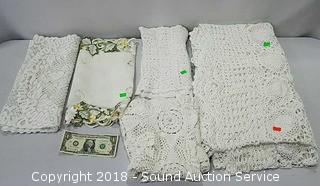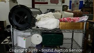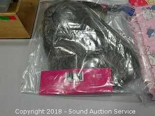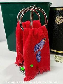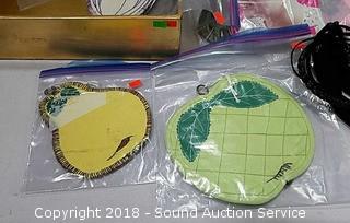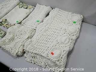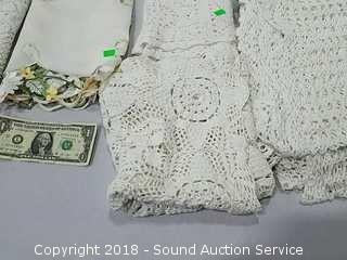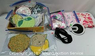 Stainless Foot Pedal Canister Garbage Can, Knitted Hot Pads, Bibs, Wig, Super Suede Shower Curtain & Eyelet Clip Rings, Keurig Rivo Frother Assembly & Rivo K-Cups, 3 Waste Baskets & Hand Towel Holder w/Towels, and Crocheted Table Runners & Tablecloths.