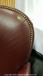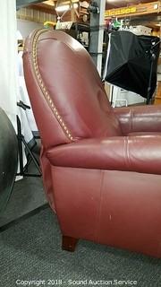 Believe it is genuine leather, has leather care cleaning instructions. Manufactured in 12/06. In good condition. Very comfortable. Works well. Has decorative nail accents. Approx. 21" wide seat. 37" wide overall.