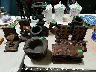 Includes: mugs, candlestick holders, trinket box, spanish wood hand crafted, and more. Please refer to photos.