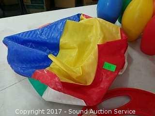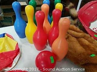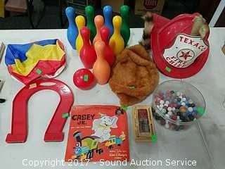 Includes super magnet, beach ball, plastic bowling pins, fire chief hat, marksman darts and disney records.