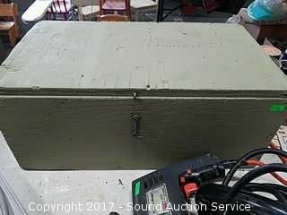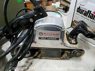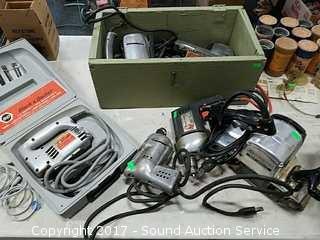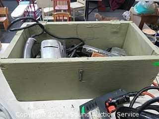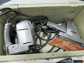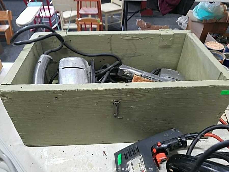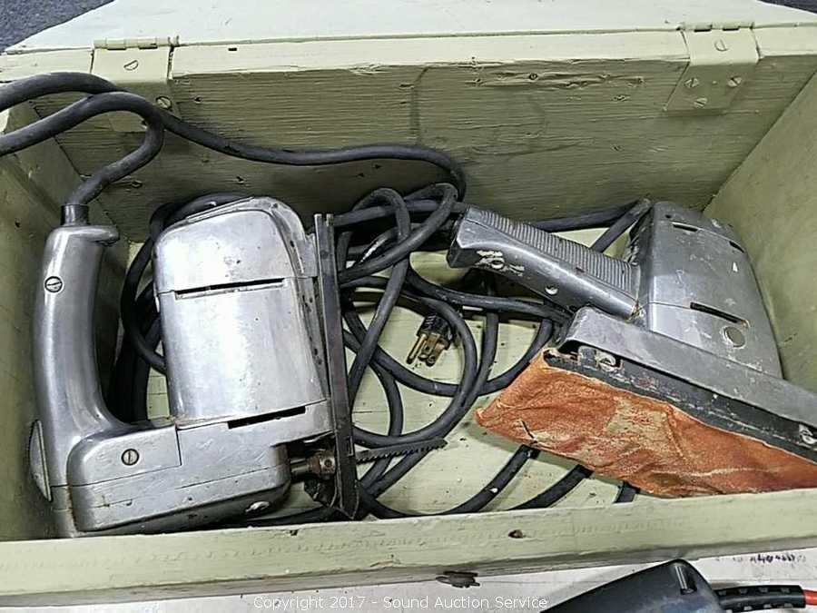 Comes with old wooden box, Craftsman jigsaw, sander, black & decker jigsaw, (2) vintage black & decker drills, and Rockwell belt sander.