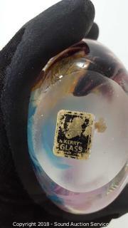 Both have a makers mark sticker. "Kerry's Glass" and "Gorgeous Designs". Approx. 2-1/4" and 3-1/4" diameters.