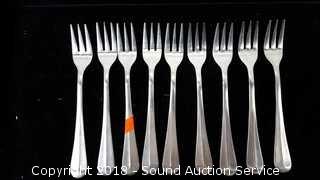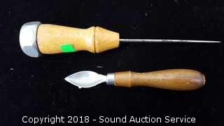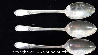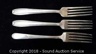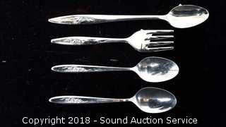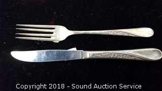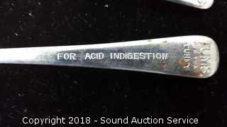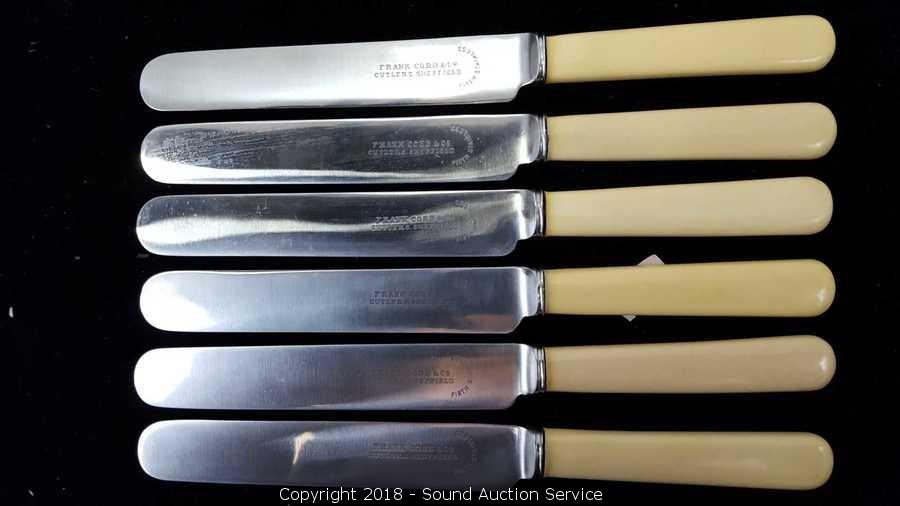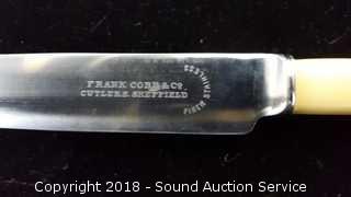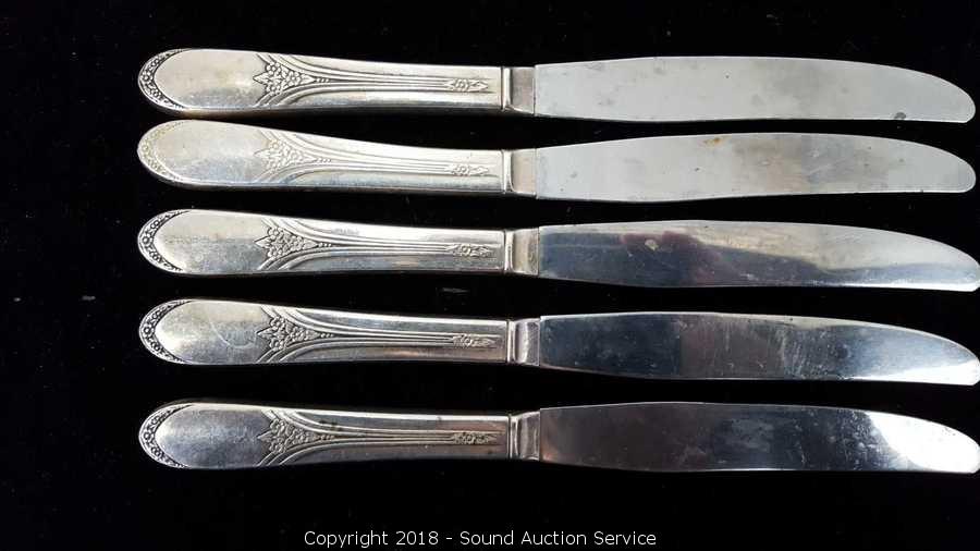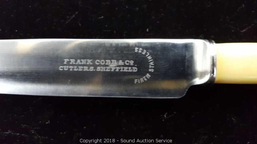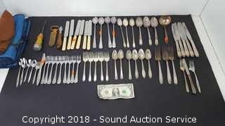 Includes: Silver cloths, Frank Cobb & Co. Bakelite handle butter knives, Community, Harmony House plate, Rogers, brass captains bottle opener, and ice pick.