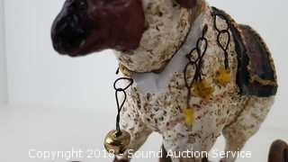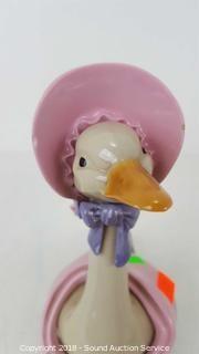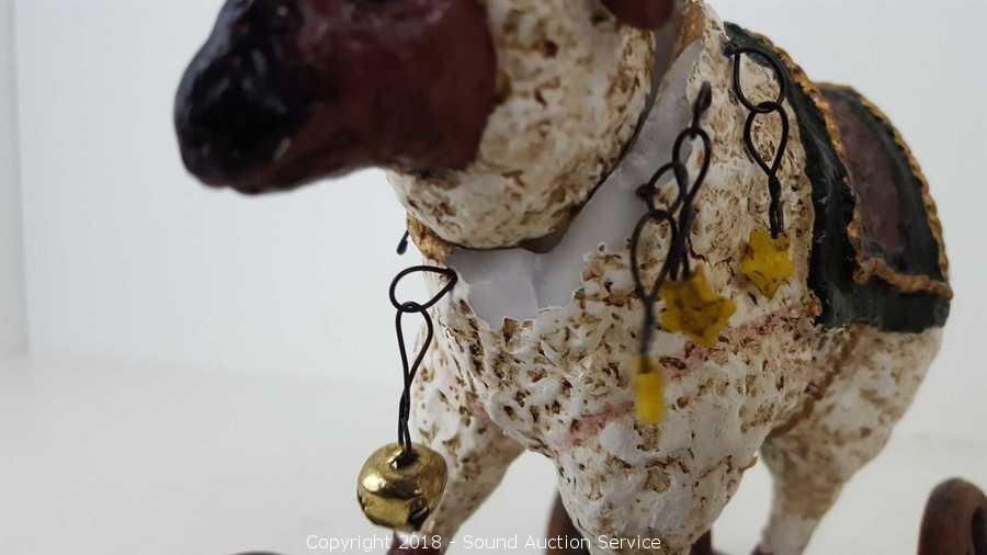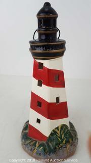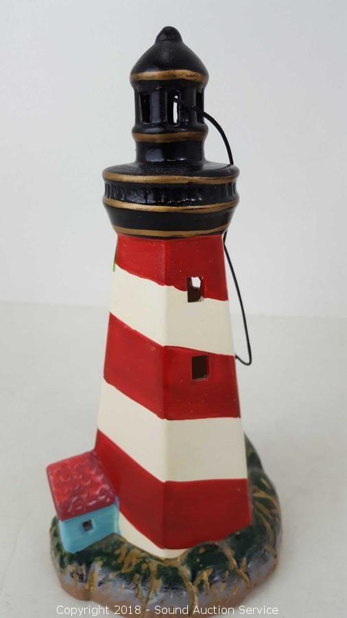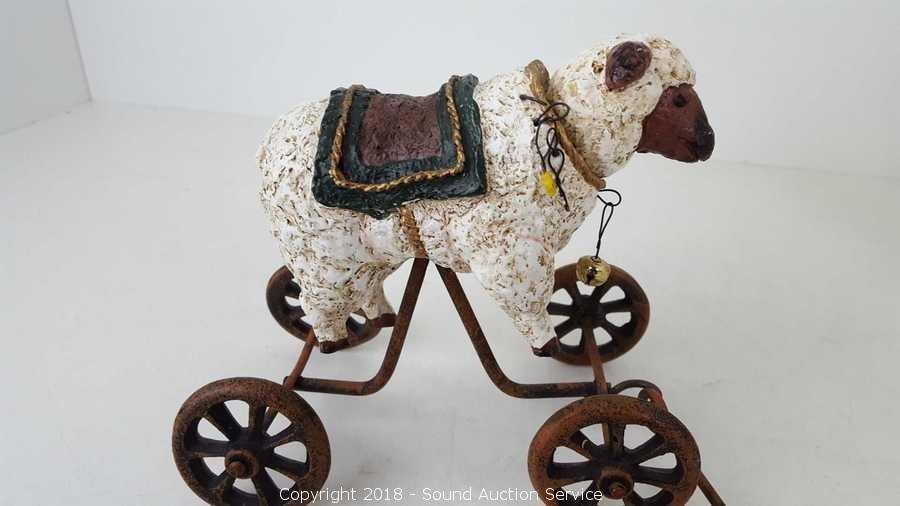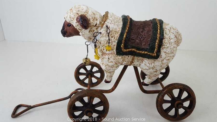 Sheep carriage has a wrought iron base, does have a chip in the neck. Lighthouse and goose are porcelain. Approx. 7" H.