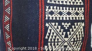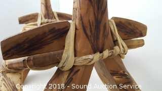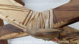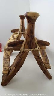 Wooden base looks to be all hand crafted with burn designs, tied together with rawhide. Has a woven seat cushion, Native American Themed. Very cool. Approx. 17-1/2" H, 21-1/2" W, 18" D.