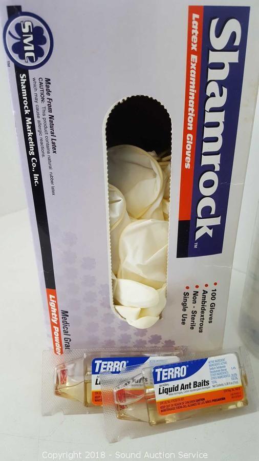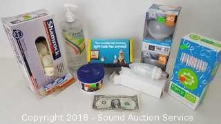 Includes: light bulbs, hand sanitizer, straws, latex examination gloves, ant bait, and silver cream.