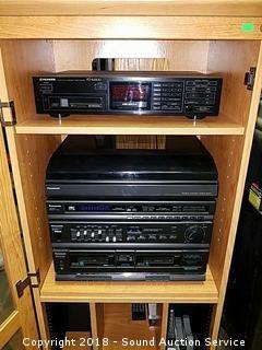 Includes: Pioneer 6-disc CD changer, (4) 6-disc cartridges, DC servo automatic turntable system, double cassette decks, stereo control amplifier, and tuner. Cabinet and stereo are both in great condition. Cabinet has glass door. Approx. 49" H, 23-1/2" W, 18-1/2" D.