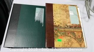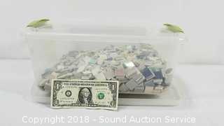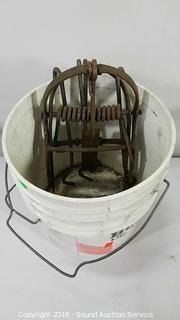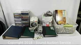 Includes: four photo albums, small bucket of mole traps, tote loaded with 1" tiles, and box loaded with various CD's.