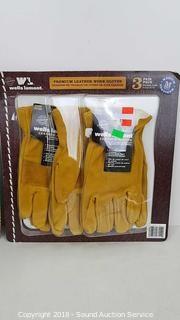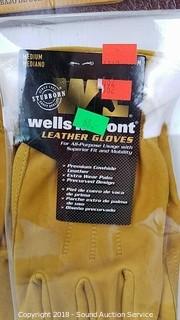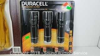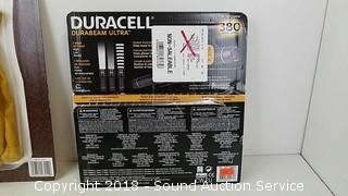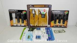5 Duracell ultra flashlights 380 lumens, 3 beam settings, Sanyo Rechargeable Battery port 8 batteries included AAA & AA, 3 Wells Lamont Premium Leather Work Gloves - Med.