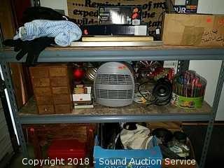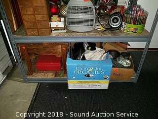 All items on the shelf and the shelf are included with this lot, it is all items that have already sold & have not been picked up. Includes: Gel Pens, Vtg. Wooden Organizer, ZTek Kids Bow, Hardware, Trinket Boxes, Drum Sticks, Salad Spinner, Slide DImmers, VHS Movies, Pur Filters, Pre-Lit Garland, Battery Charger, Head Gloves, Pajama Bottoms, Leggings, Pictures & Picture Frames, Box of Salvaged Items, Primitive Table & More!!!