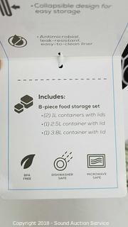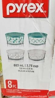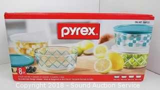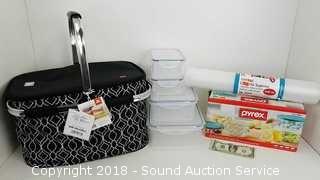 Includes: 8pc Pyrex glass containers with lids, 15ft x 18" shelf liner, and cooler bag with food storage set. All appear to be new with original tags.