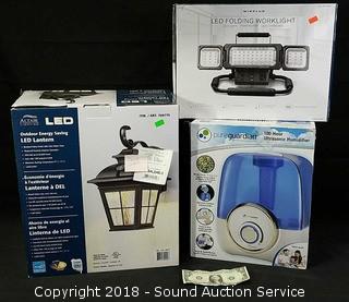 Includes: LED outdoor lantern/porch light, LED folding worklight, and PUReguardian humidifier.