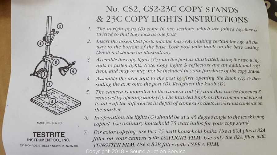 Suitable for all cameras 35mm to 4X5. Sliding arm with four roller bearings, sturdy 16" x 19" x 3/4" thick baseboard, No. 23C copy lights with 2-12" flexible arms, sockets with cool control knobs, and metal reflectors. No bulbs.