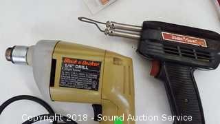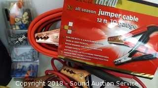 Includes: (2) Sets of Jumper Cables, Cordless Screwdriver, Soldering Gun, Wire Connectors, Bunjee Cords and more. All tested, works. Condition of items sold - The auctioneer shall not be responsible for the correct description, authenticity, genuineness of, estimated selling price of, or defect in any lot, and makes no warranty in connection therewith. No allowance will be made or sale set aside on account of any incorrectness, error in cataloging, or any imperfection not noted. No deduction will be allowed on damaged articles as all goods being exposed for public exhibition are sold “as is” and without recourse. All measurements and sizes - are approximate. Claims - No claims will be allowed after goods are removed from premises. All lots - to be sold AS IS, WHERE IS. ALL SALES FINAL, WE DO NOT ACCEPT RETURNS.