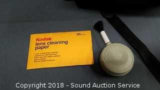 Very nice well made bag, comes with lens cleaning paper and blower brush. Condition of items sold - The auctioneer shall not be responsible for the correct description, authenticity, genuineness of, estimated selling price of, or defect in any lot, and makes no warranty in connection therewith. No allowance will be made or sale set aside on account of any incorrectness, error in cataloging, or any imperfection not noted. No deduction will be allowed on damaged articles as all goods being exposed for public exhibition are sold “as is” and without recourse. All measurements and sizes - are approximate. Claims - No claims will be allowed after goods are removed from premises. All lots - to be sold AS IS, WHERE IS. ALL SALES FINAL, WE DO NOT ACCEPT RETURNS.