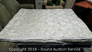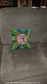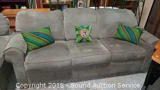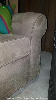 Comes with three throw pillows. Approx. 7ft L, 36" H. Condition of items sold - The auctioneer shall not be responsible for the correct description, authenticity, genuineness of, estimated selling price of, or defect in any lot, and makes no warranty in connection therewith. No allowance will be made or sale set aside on account of any incorrectness, error in cataloging, or any imperfection not noted. No deduction will be allowed on damaged articles as all goods being exposed for public exhibition are sold “as is” and without recourse. All measurements and sizes - are approximate. Claims - No claims will be allowed after goods are removed from premises. All lots - to be sold AS IS, WHERE IS. ALL SALES FINAL, WE DO NOT ACCEPT RETURNS.