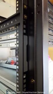 Made in USA. Solid steel construction. On castors, Hardware screws. Approx. 80" H, 23" W, 32" D. Servers not included this is for just the rack. Condition of items sold - The auctioneer shall not be responsible for the correct description, authenticity, genuineness of, estimated selling price of, or defect in any lot, and makes no warranty in connection therewith. No allowance will be made or sale set aside on account of any incorrectness, error in cataloging, or any imperfection not noted. No deduction will be allowed on damaged articles as all goods being exposed for public exhibition are sold “as is” and without recourse. All measurements and sizes - are approximate. Claims - No claims will be allowed after goods are removed from premises. All lots - to be sold AS IS, WHERE IS. ALL SALES FINAL, WE DO NOT ACCEPT RETURNS.