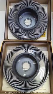Lamp is adjustable, model B, in original box. Filters are 5-1/2". Carousels are Carousel Transvue 140 slide trays. Condition of items sold - The auctioneer shall not be responsible for the correct description, authenticity, genuineness of, estimated selling price of, or defect in any lot, and makes no warranty in connection therewith. No allowance will be made or sale set aside on account of any incorrectness, error in cataloging, or any imperfection not noted. No deduction will be allowed on damaged articles as all goods being exposed for public exhibition are sold “as is” and without recourse. All measurements and sizes - are approximate. Claims - No claims will be allowed after goods are removed from premises. All lots - to be sold AS IS, WHERE IS. ALL SALES FINAL, WE DO NOT ACCEPT RETURNS.