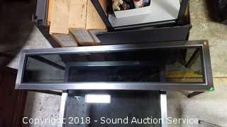 Brushed steel frame. Approx. 5ft L, 14" D, 28" H. Condition of items sold - The auctioneer shall not be responsible for the correct description, authenticity, genuineness of, estimated selling price of, or defect in any lot, and makes no warranty in connection therewith. No allowance will be made or sale set aside on account of any incorrectness, error in cataloging, or any imperfection not noted. No deduction will be allowed on damaged articles as all goods being exposed for public exhibition are sold “as is” and without recourse. All measurements and sizes - are approximate. Claims - No claims will be allowed after goods are removed from premises. All lots - to be sold AS IS, WHERE IS. ALL SALES FINAL, WE DO NOT ACCEPT RETURNS.