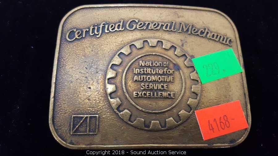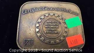 1978 Solid Brass Buckle, Certified General Mechanic Buckle, Dennisons Chili Buckle, and other. Condition of items sold - The auctioneer shall not be responsible for the correct description, authenticity, genuineness of, estimated selling price of, or defect in any lot, and makes no warranty in connection therewith. No allowance will be made or sale set aside on account of any incorrectness, error in cataloging, or any imperfection not noted. No deduction will be allowed on damaged articles as all goods being exposed for public exhibition are sold “as is” and without recourse. All measurements and sizes - are approximate. Claims - No claims will be allowed after goods are removed from premises. All lots - to be sold AS IS, WHERE IS. ALL SALES FINAL, WE DO NOT ACCEPT RETURNS.