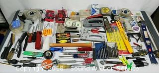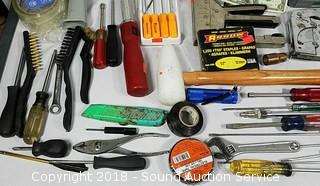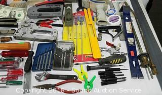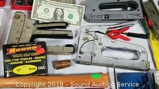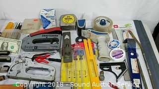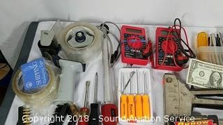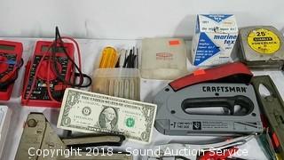 Includes: Digital Multimeters (Work), Screwdrivers, Hook Tool Set, Electrical Screwdriver Set, Craftsman LED Hanging Light, Tape Guns, Staple Guns, Staples, Pry Bar, Carpenters Square and more. Condition of items sold - The auctioneer shall not be responsible for the correct description, authenticity, genuineness of, estimated selling price of, or defect in any lot, and makes no warranty in connection therewith. No allowance will be made or sale set aside on account of any incorrectness, error in cataloging, or any imperfection not noted. No deduction will be allowed on damaged articles as all goods being exposed for public exhibition are sold “as is” and without recourse. All measurements and sizes - are approximate. Claims - No claims will be allowed after goods are removed from premises. All lots - to be sold AS IS, WHERE IS. ALL SALES FINAL, WE DO NOT ACCEPT RETURNS.
