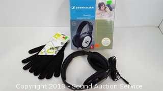 Sennheiser HD201 Over the Ear Headphones, Comes with original box. Gloves are size medium/large. Condition of items sold - The auctioneer shall not be responsible for the correct description, authenticity, genuineness of, estimated selling price of, or defect in any lot, and makes no warranty in connection therewith. No allowance will be made or sale set aside on account of any incorrectness, error in cataloging, or any imperfection not noted. No deduction will be allowed on damaged articles as all goods being exposed for public exhibition are sold “as is” and without recourse. All measurements and sizes - are approximate. Claims - No claims will be allowed after goods are removed from premises. All lots - to be sold AS IS, WHERE IS. ALL SALES FINAL, WE DO NOT ACCEPT RETURNS.