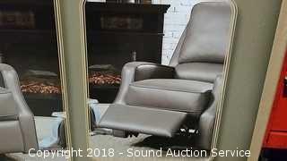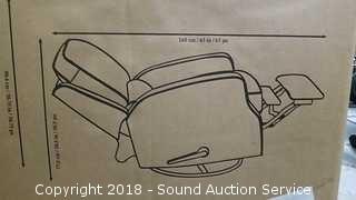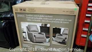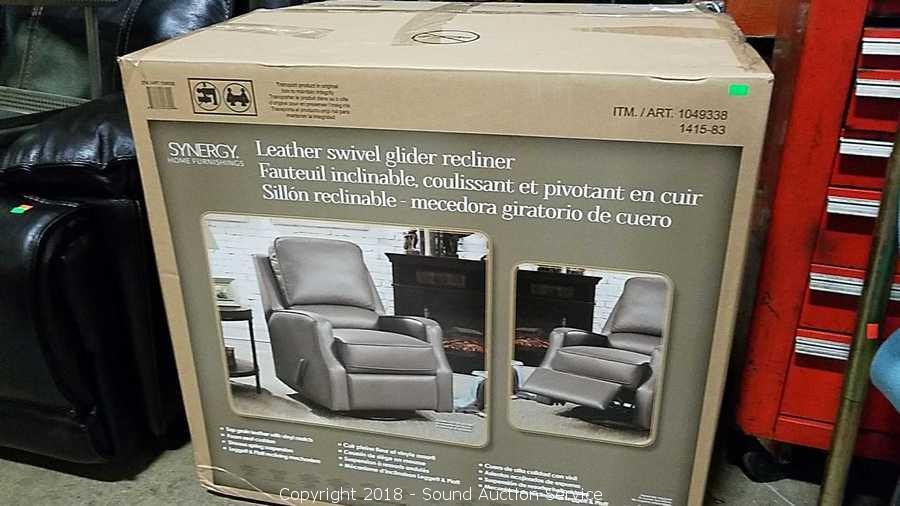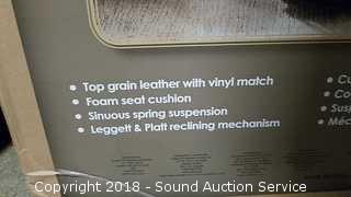 Comes in original box. By Synergy Home Furnishings. Top grain leather with vinyl match, Leggett & Platt reclining mechanism. Refer to photos for details. Condition of items sold - The auctioneer shall not be responsible for the correct description, authenticity, genuineness of, estimated selling price of, or defect in any lot, and makes no warranty in connection therewith. No allowance will be made or sale set aside on account of any incorrectness, error in cataloging, or any imperfection not noted. No deduction will be allowed on damaged articles as all goods being exposed for public exhibition are sold “as is” and without recourse. All measurements and sizes - are approximate. Claims - No claims will be allowed after goods are removed from premises. All lots - to be sold AS IS, WHERE IS. ALL SALES FINAL, WE DO NOT ACCEPT RETURNS.