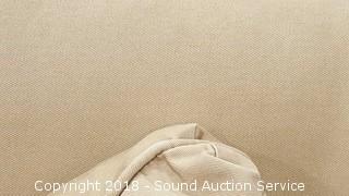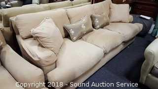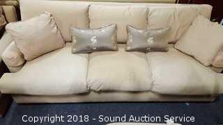 Cushions and pillows are 75% gray duck feather, 25% gray duck down. One cushion has some discoloration. Comes with (4) down throw pillows. Approx. 86" L, 30" H, 38" D. Condition of items sold - The auctioneer shall not be responsible for the correct description, authenticity, genuineness of, estimated selling price of, or defect in any lot, and makes no warranty in connection therewith. No allowance will be made or sale set aside on account of any incorrectness, error in cataloging, or any imperfection not noted. No deduction will be allowed on damaged articles as all goods being exposed for public exhibition are sold “as is” and without recourse. All measurements and sizes - are approximate. Claims - No claims will be allowed after goods are removed from premises. All lots - to be sold AS IS, WHERE IS. ALL SALES FINAL, WE DO NOT ACCEPT RETURNS.