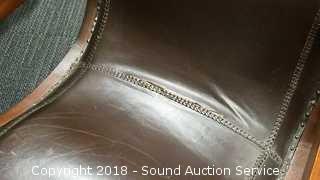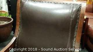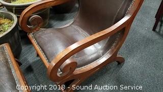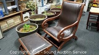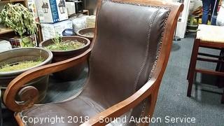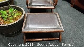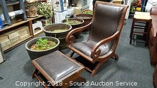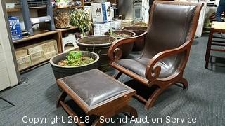 Contour shape, very comfortable. Nice scrollwork on the arms. All looks to be handcrafted, can see the imperfections. Leather has come free from the stitching in the seat. Chair has a 21" wide seat, overall approx. 24" W, 38" H, 28" D. Ottoman is approx. 13" H, 23-1/2" L, 18" W. Condition of items sold - The auctioneer shall not be responsible for the correct description, authenticity, genuineness of, estimated selling price of, or defect in any lot, and makes no warranty in connection therewith. No allowance will be made or sale set aside on account of any incorrectness, error in cataloging, or any imperfection not noted. No deduction will be allowed on damaged articles as all goods being exposed for public exhibition are sold “as is” and without recourse. All measurements and sizes - are approximate. Claims - No claims will be allowed after goods are removed from premises. All lots - to be sold AS IS, WHERE IS. ALL SALES FINAL, WE DO NOT ACCEPT RETURNS.