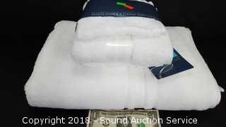 Includes: (1) bath towel, (2) hand towels, and (1) washcloth. 100% cotton. White. Condition of items sold - The auctioneer shall not be responsible for the correct description, authenticity, genuineness of, estimated selling price of, or defect in any lot, and makes no warranty in connection therewith. No allowance will be made or sale set aside on account of any incorrectness, error in cataloging, or any imperfection not noted. No deduction will be allowed on damaged articles as all goods being exposed for public exhibition are sold “as is” and without recourse. All measurements and sizes - are approximate. Claims - No claims will be allowed after goods are removed from premises. All lots - to be sold AS IS, WHERE IS. ALL SALES FINAL, WE DO NOT ACCEPT RETURNS.