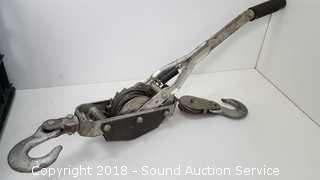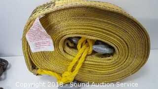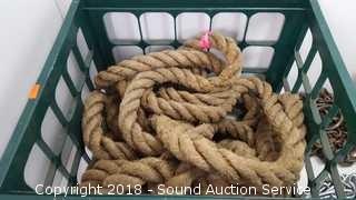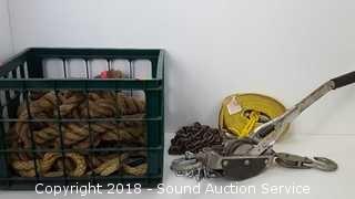 Lot #0156: Crate w/Heavy Duty Strap, Rope, Chain & Come Along