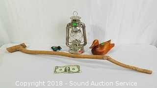 Lot #0317: Dietz Barn Lantern, Wooden Ducks & Branch Cane