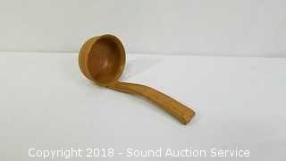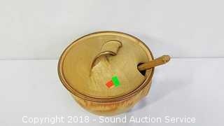 Comes with ladle. Very well crafted. Approx. 6" H, 8-1/2" diameter. Condition of items sold - The auctioneer shall not be responsible for the correct description, authenticity, genuineness of, estimated selling price of, or defect in any lot, and makes no warranty in connection therewith. No allowance will be made or sale set aside on account of any incorrectness, error in cataloging, or any imperfection not noted. No deduction will be allowed on damaged articles as all goods being exposed for public exhibition are sold “as is” and without recourse. All measurements and sizes - are approximate. Claims - No claims will be allowed after goods are removed from premises. All lots - to be sold AS IS, WHERE IS. ALL SALES FINAL, WE DO NOT ACCEPT RETURNS.