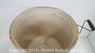 With a spot for handles, missing one of the handles. Approx. 16" diameter, 17" H. Condition of items sold - The auctioneer shall not be responsible for the correct description, authenticity, genuineness of, estimated selling price of, or defect in any lot, and makes no warranty in connection therewith. No allowance will be made or sale set aside on account of any incorrectness, error in cataloging, or any imperfection not noted. No deduction will be allowed on damaged articles as all goods being exposed for public exhibition are sold “as is” and without recourse. All measurements and sizes - are approximate. Claims - No claims will be allowed after goods are removed from premises. All lots - to be sold AS IS, WHERE IS. ALL SALES FINAL, WE DO NOT ACCEPT RETURNS.