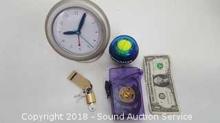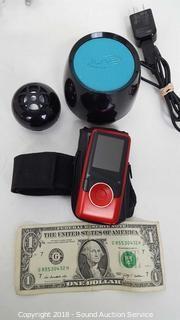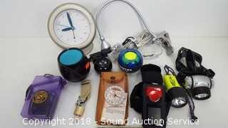 Includes: Clock, bluetooth speakers, Coby 12GB MP3 player with athletic arm strap, LED flashlights, headlamp, and more. Condition of items sold - The auctioneer shall not be responsible for the correct description, authenticity, genuineness of, estimated selling price of, or defect in any lot, and makes no warranty in connection therewith. No allowance will be made or sale set aside on account of any incorrectness, error in cataloging, or any imperfection not noted. No deduction will be allowed on damaged articles as all goods being exposed for public exhibition are sold “as is” and without recourse. All measurements and sizes - are approximate. Claims - No claims will be allowed after goods are removed from premises. All lots - to be sold AS IS, WHERE IS. ALL SALES FINAL, WE DO NOT ACCEPT RETURNS.