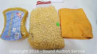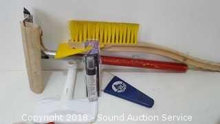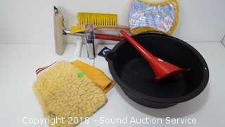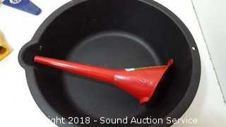 Lot #0068: Oil Pan, Funnel, Squeegee, Scraper & Buffing Cloths