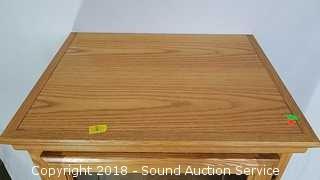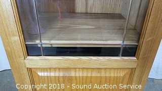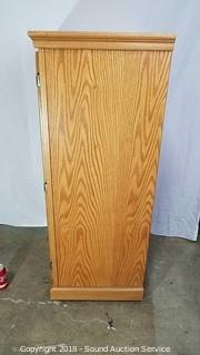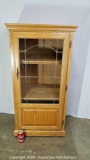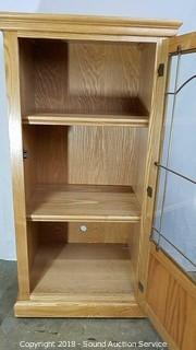 Has two adjustable shelves. Oak finish. Approx. 45-1/2" H, 23" W, 17-1/2" D. Condition of items sold - The auctioneer shall not be responsible for the correct description, authenticity, genuineness of, estimated selling price of, or defect in any lot, and makes no warranty in connection therewith. No allowance will be made or sale set aside on account of any incorrectness, error in cataloging, or any imperfection not noted. No deduction will be allowed on damaged articles as all goods being exposed for public exhibition are sold “as is” and without recourse. All measurements and sizes - are approximate. Claims - No claims will be allowed after goods are removed from premises. All lots - to be sold AS IS, WHERE IS. ALL SALES FINAL, WE DO NOT ACCEPT RETURNS.