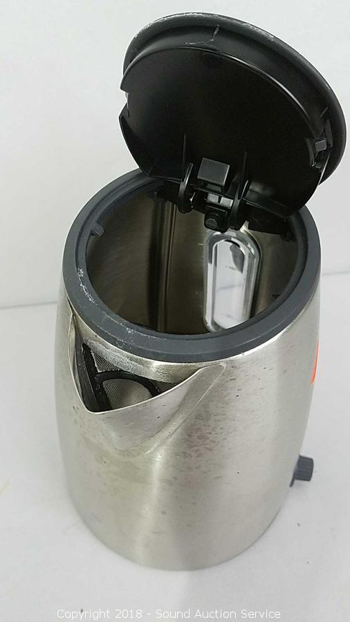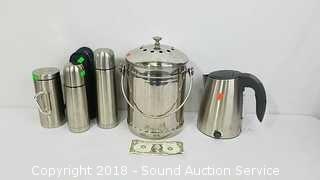 Includes: Electric Tea Kettle (Has strainer on spout), Stainless Travel Thermoses & Stainless Ice Bucket. Condition of items sold - The auctioneer shall not be responsible for the correct description, authenticity, genuineness of, estimated selling price of, or defect in any lot, and makes no warranty in connection therewith. No allowance will be made or sale set aside on account of any incorrectness, error in cataloging, or any imperfection not noted. No deduction will be allowed on damaged articles as all goods being exposed for public exhibition are sold “as is” and without recourse. All measurements and sizes - are approximate. Claims - No claims will be allowed after goods are removed from premises. All lots - to be sold AS IS, WHERE IS. ALL SALES FINAL, WE DO NOT ACCEPT RETURNS.