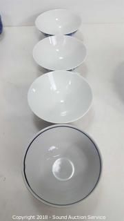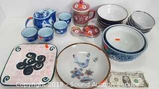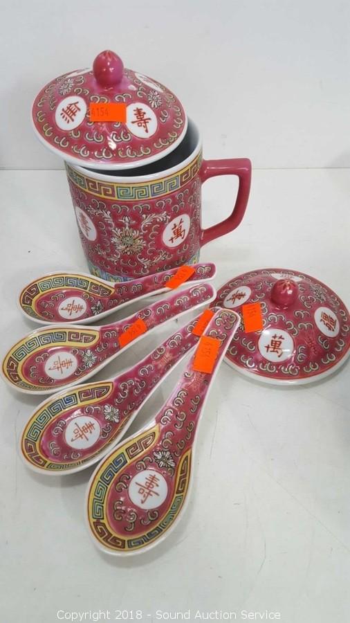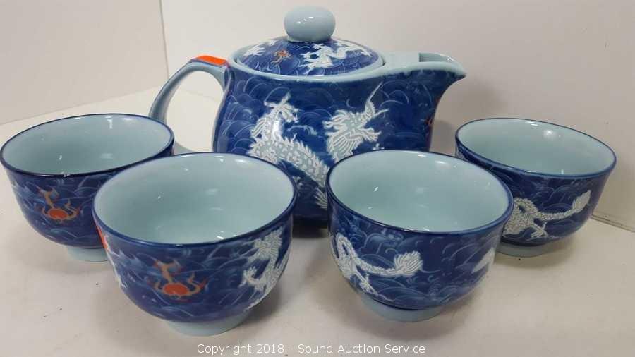 Includes: Beautiful Blue Dragon Tea Set (Has an "S" Hallmark), Porcelain Ramen Spoons, Small Bowls, and more. Condition of items sold - The auctioneer shall not be responsible for the correct description, authenticity, genuineness of, estimated selling price of, or defect in any lot, and makes no warranty in connection therewith. No allowance will be made or sale set aside on account of any incorrectness, error in cataloging, or any imperfection not noted. No deduction will be allowed on damaged articles as all goods being exposed for public exhibition are sold “as is” and without recourse. All measurements and sizes - are approximate. Claims - No claims will be allowed after goods are removed from premises. All lots - to be sold AS IS, WHERE IS. ALL SALES FINAL, WE DO NOT ACCEPT RETURNS.